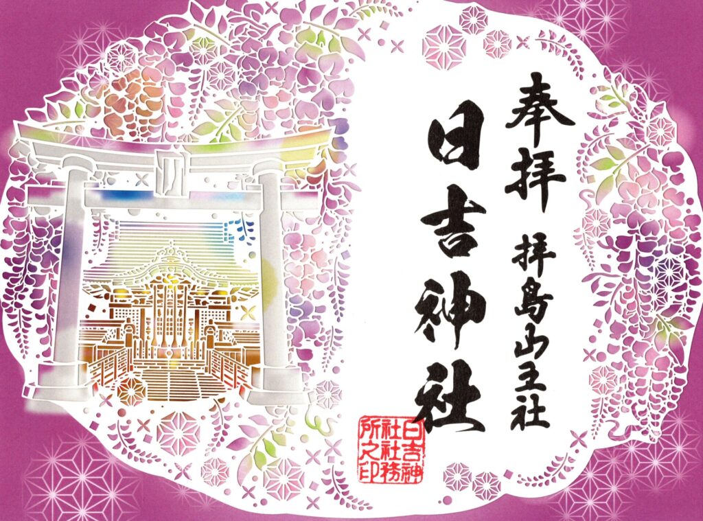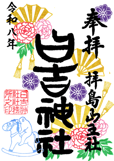 6.通常御朱印―通常御朱印は一月四日から通年で直書きいたします。日吉神社の祭礼である榊祭の榊をあしらい、神紋の巴の紋を配しています。また日吉神社の神の使いである猿と今年の干支である巳を描いています。(初穂料五百円)